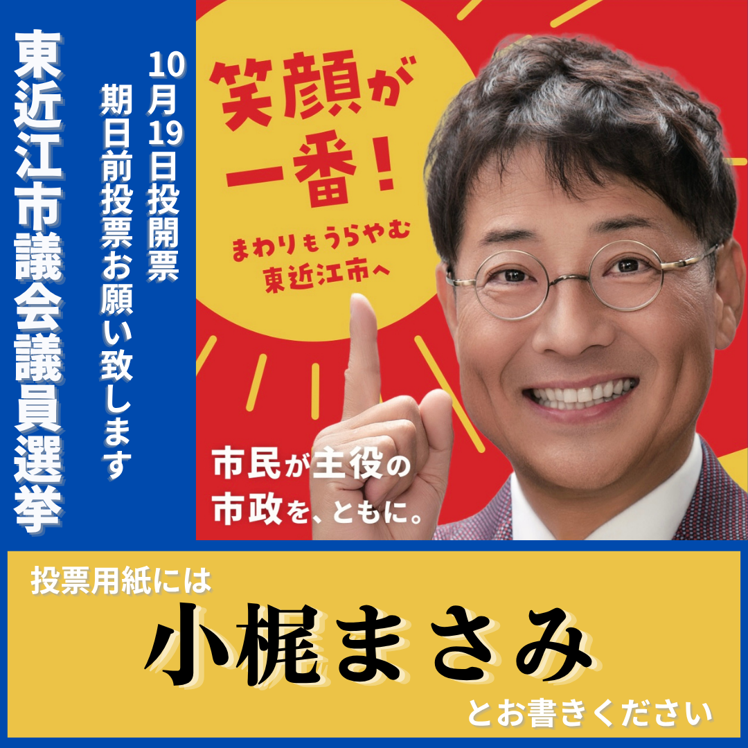 #東近江市 #市議会議員選挙 #小梶まさみ #笑顔が一番 #挑戦するまち #稼ぐ行政 #東近江の未来へ